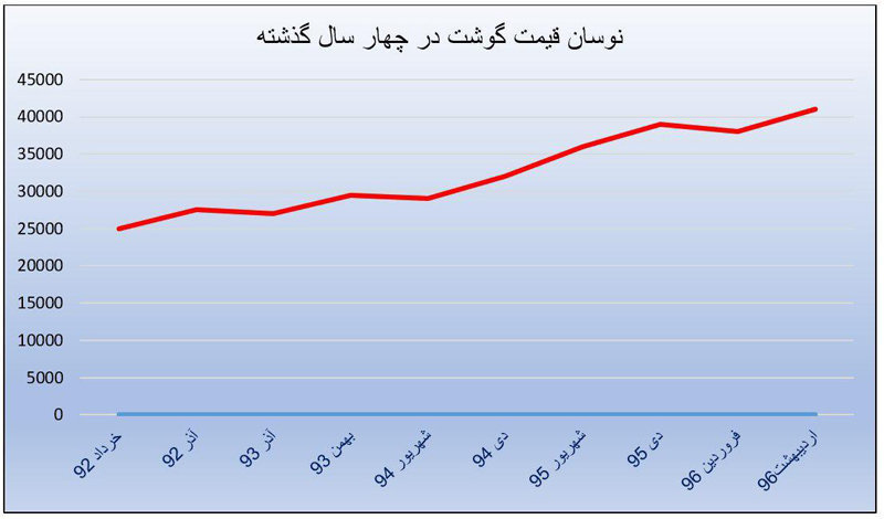 از سوی دیگر نگاهی به نوسانات قیمت گوشت در ۴ سال گذشته نشان میدهد که قیمت این کالا از خرداد ۹۲ تا اردیبهشت ماه امسال ۶۴ درصد افزایش داشته است؛ جدول و نمودار زیر روند تغییرات قیمتی گوشت طی ۴ سال گذشته را نشان میدهد؛